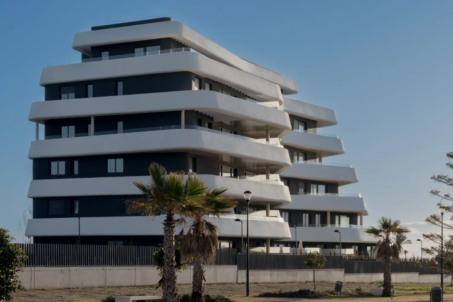 Residential project in four phases for which we proposed an avant-garde design inspired by the Mediterranean Sea, creating gentle waves on its façade and asymmetrical terraces that imitate the uneven movement of the water as it breaks on the shore. Its aesthetics and its orientation towards the sea contribute to its harmonious integration into the coastal landscape and to receiving more natural light, which has contributed to the project obtaining the SPATIUM Seal (backed by the international certifier IMQ), which endorses Alborán as a Safe and Healthy Residential Development