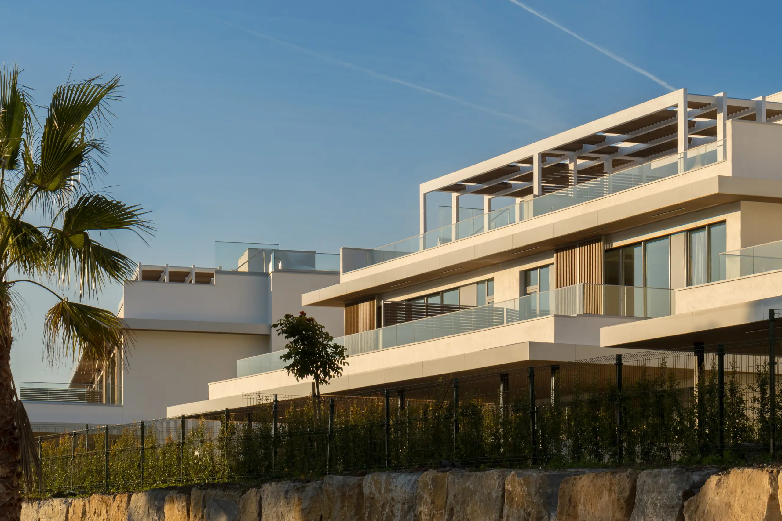 The interior spaces are as important as the exterior, taking special care of their integration: from the inside with individual swimming pools in the garden or solarium; and from the outside with a communal swimming pool with beach access, jacuzzi, waterfalls and cascades