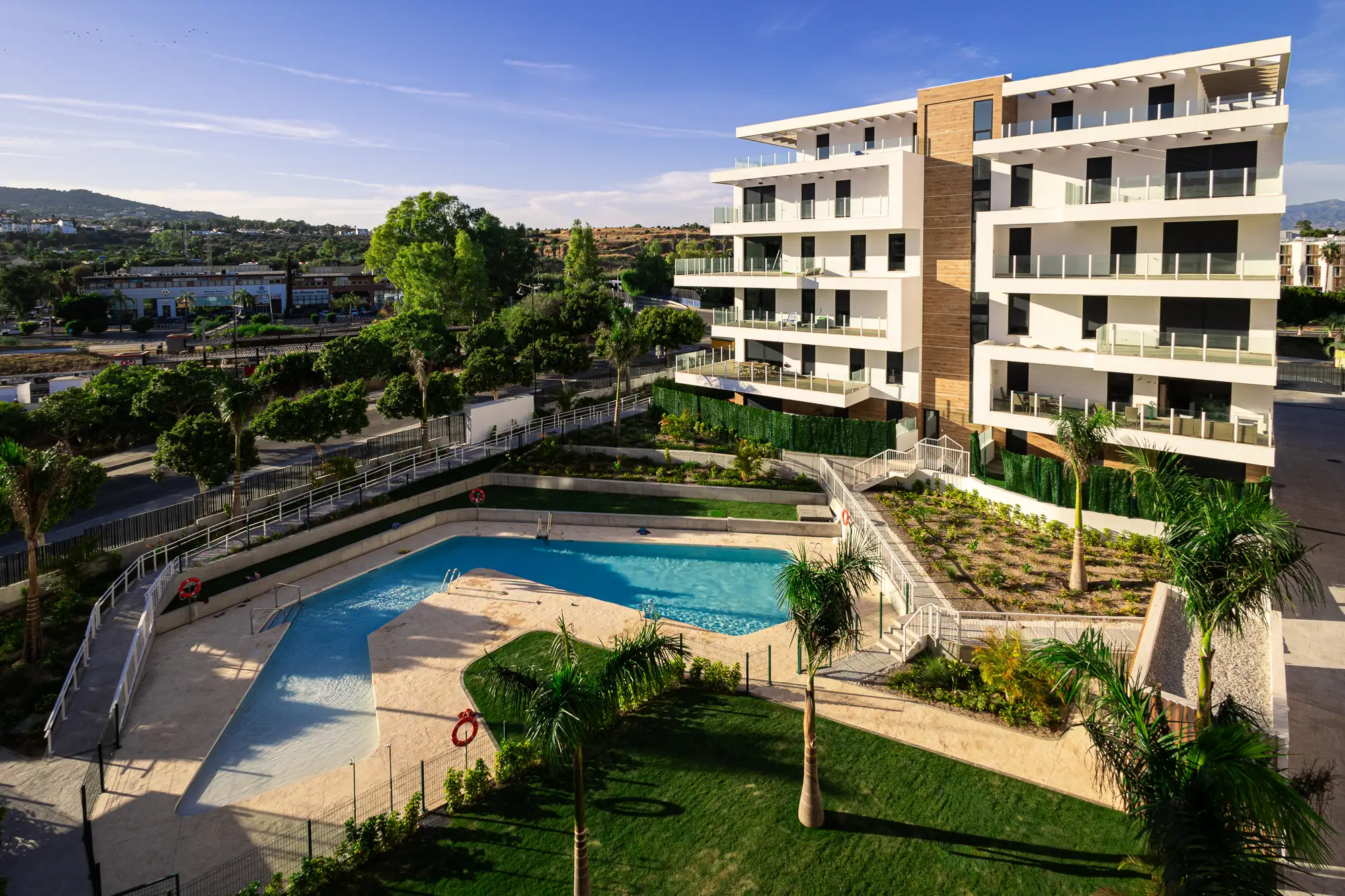 Alamos Hills is a residential complex comprising 43 homes, parking spaces, and storage rooms located on plot R-1.4 in sector SUP R-2.6 of Torremolinos. The project is developed in two blocks adapted to the natural slope of the land, allowing for efficient implementation and balanced integration into the urban environment. The architecture is defined by clean volumes, white plaster facades combined with ceramic panels and metal railings, creating a contemporary and durable image. The orientation and layout of the openings optimize natural lighting and cross ventilation, while the thermal envelope and the use of aerothermal systems ensure high energy efficiency. The project clearly resolves accesses and differences in elevation, focusing on accessible routes and rational execution. Alamos Hills represents functional, efficient architecture adapted to the landscape of Torremolinos.